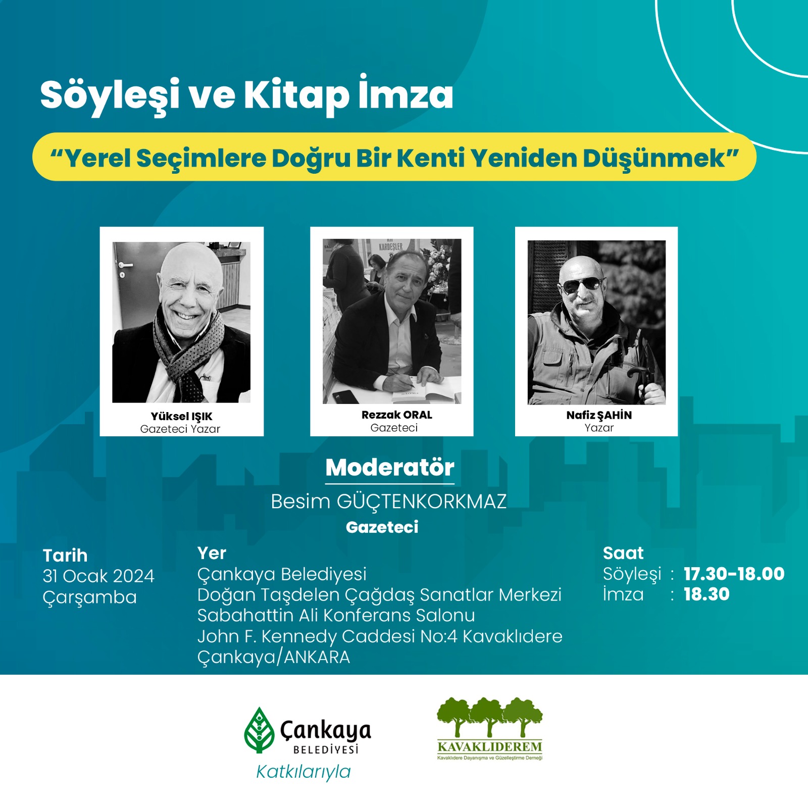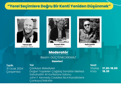 Kavaklıderem Derneği tarafından düzenlenen, "YEREL SEÇİMLERE DOĞRU BİR KENTİ YENİDEN DÜŞÜNMEK" konulu söyleşide, 3 yazar konu ile ilgili görüşlerini açıkladı ve toplantı sonunda da okuyucuları için kitaplarını imzaladı.